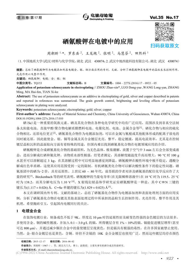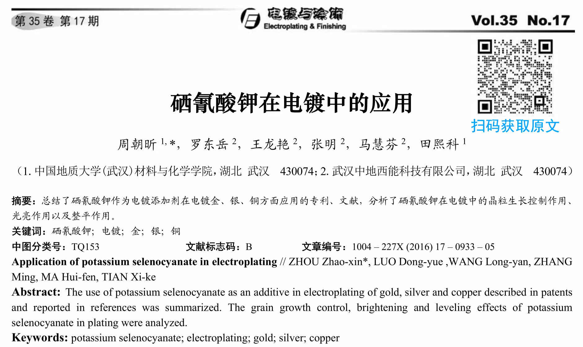 硒(Se)是一種重要的氧族元素。硒及其化合物在各種電化學研究中均有廣泛應用,范圍涉及到非真空法制備太陽能電池、直接甲醇/聚合物電解質膜燃料電池、電催化劑、電池、金屬合金等 [1] 。硒化合物與相應的硫化合物相比,還原電位更正 [2] 。硒氰基化合物作為電鍍添加劑,可以在金屬與氰根或其他配體形成的配離子放電的同時被還原,因此能使金、銀、銅等金屬及其合金鍍層光亮、整平,穩定鍍液,提高電流效率,尤其是在控制鍍層晶粒沉積的晶面取向方面有著特殊的用途,但國內難以找到硒氰基化合物在電鍍領域應用的介紹。