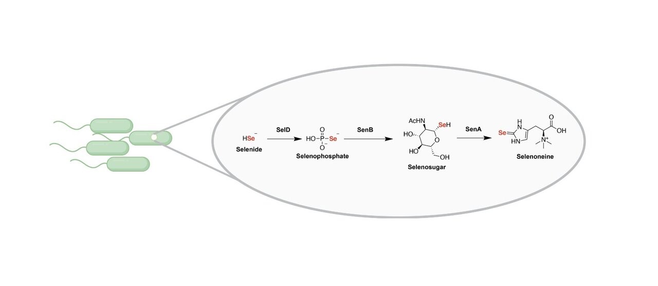 圖中顯示了將硒整入到微生物小分子中的生物合成途徑,圖片來自Nature, 2022, doi:10.1038/s41586-022-05174-2。